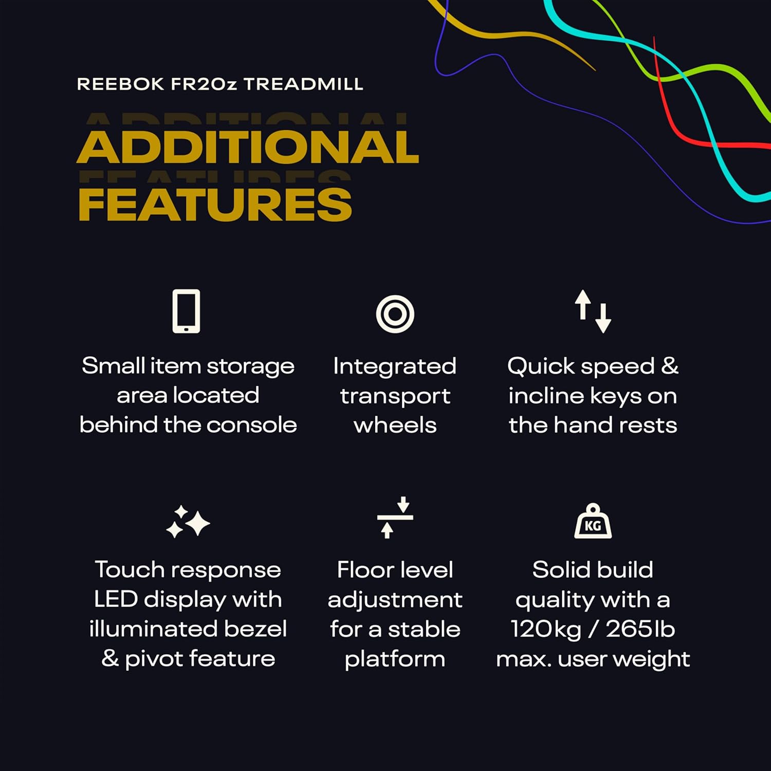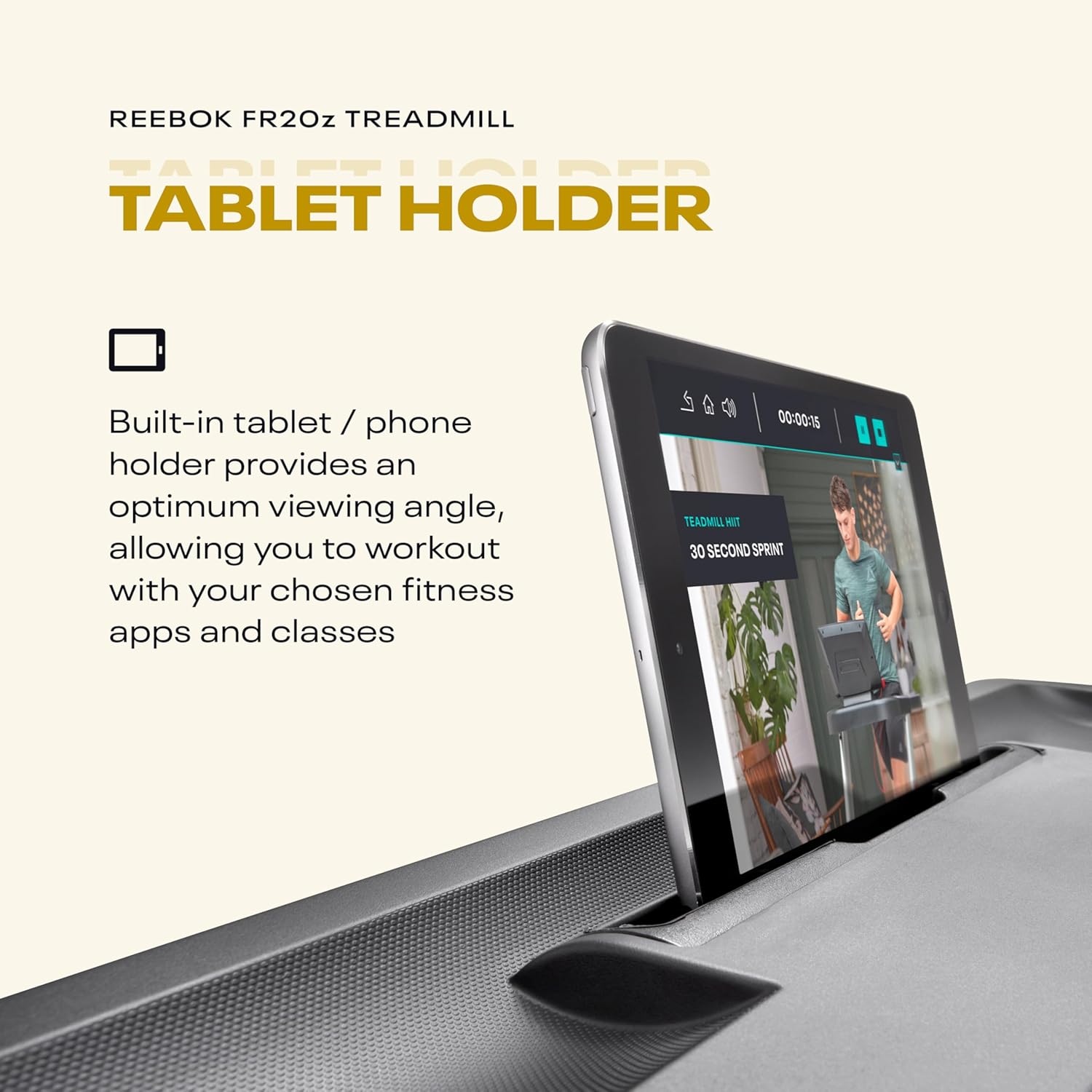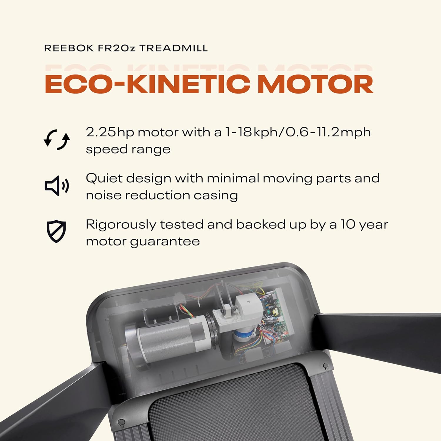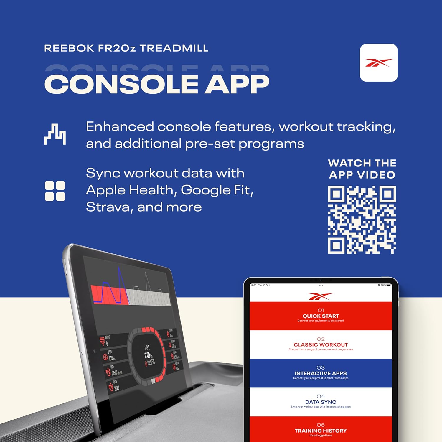 The Reebok FR20z Floatride Treadmill is a top running machine that combines the comfort of home training with an outdoor running experience. Powered by a reliable eco-Kinetic 2.25 horsepower motor, the FR20z offers a maximum speed of 18kph (11mph), 15 levels of power incline and 24 onboard workouts. A large running area of 46cm (18”) by 140cm (55”) provides comfort during your runs while the finely tuned Floatride+ cushioning system significantly reduces the impact on your joints. Thanks to the Kinomap (60-day Free Kinomap trial included) and Zwift apps compatibility, you can enjoy an immersive online running experience and join a global community of connected runners. This space-friendly treadmill from Reebok delivers clear feedback and enables progress tracking.